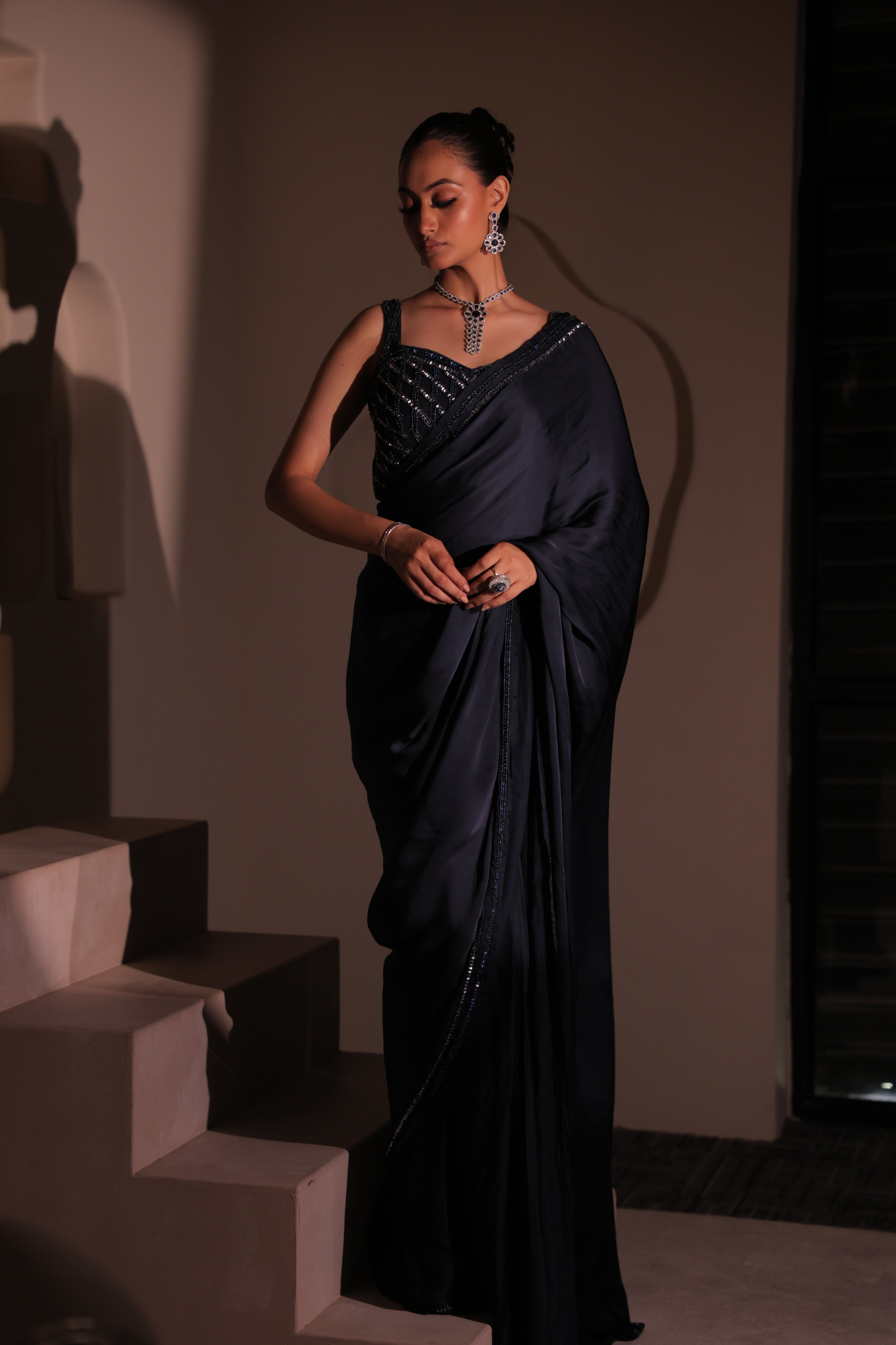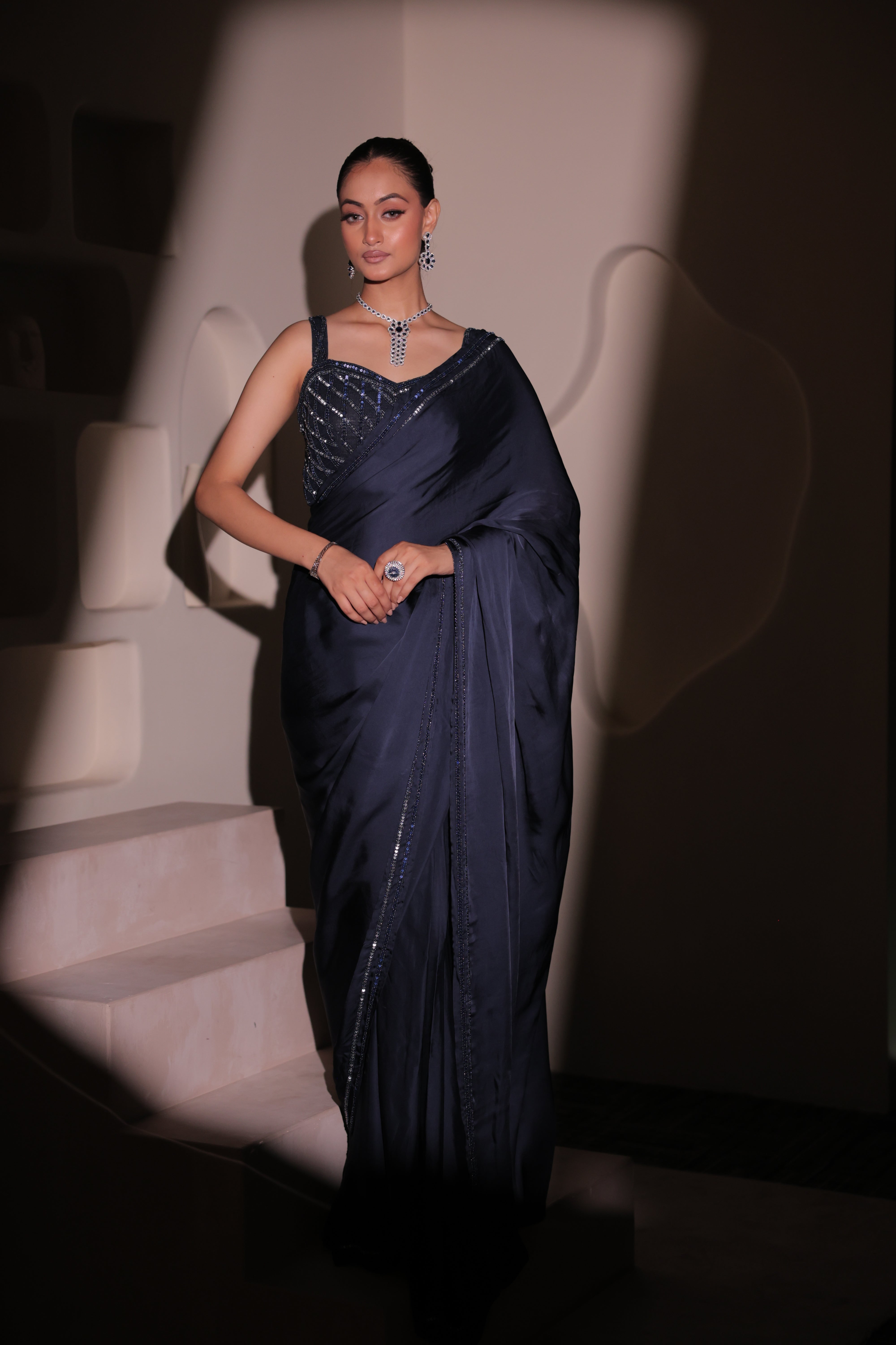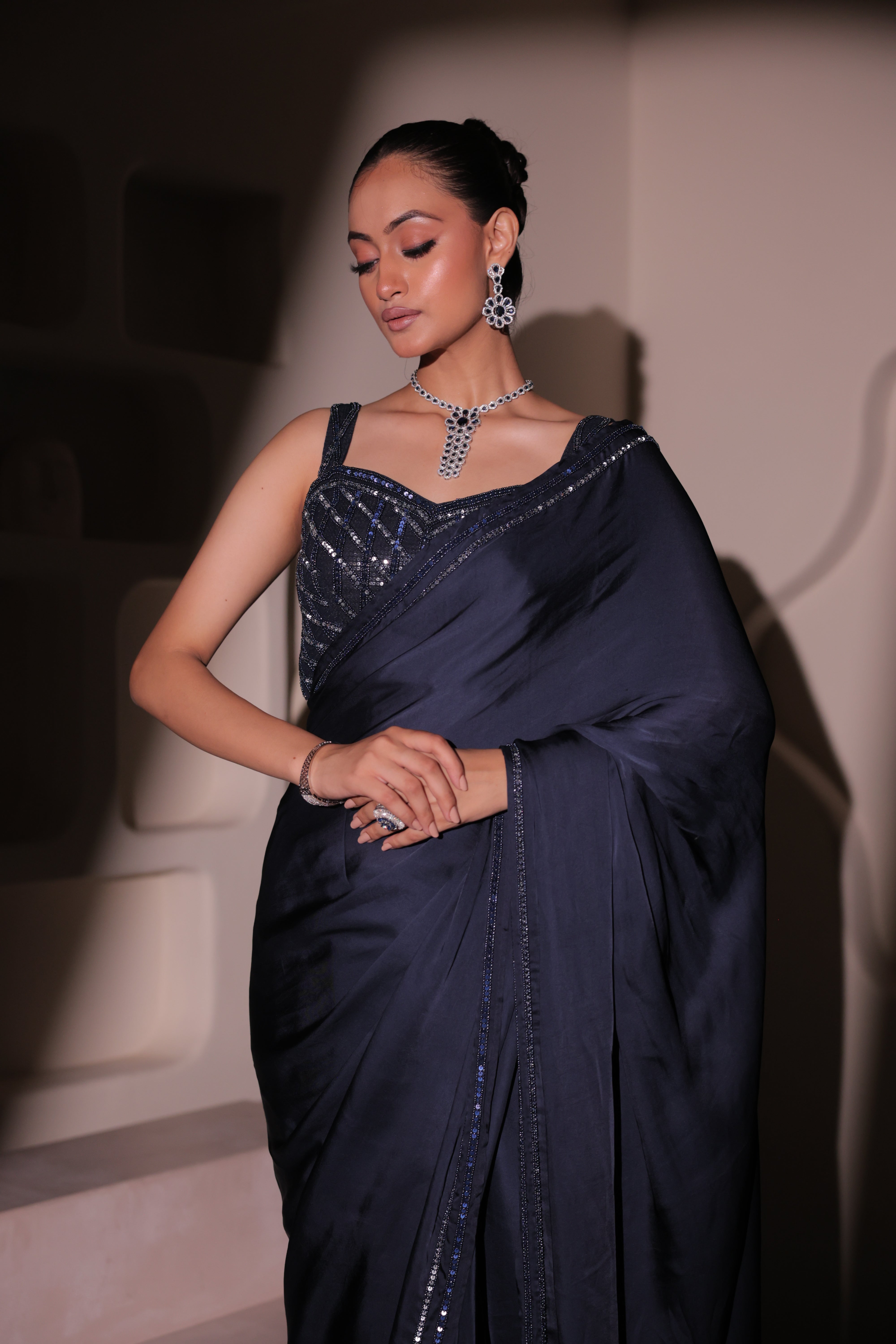 Complementing the saree is a meticulously designed Midnight Blue Embellished Blouse. This blouse is typically adorned with intricate hand-embroidery, featuring shimmering sequins, delicate beads, or crystal work that stands out against the rich fabric. The sleeveless cut and sophisticated neckline complete the modern and glamorous look.
