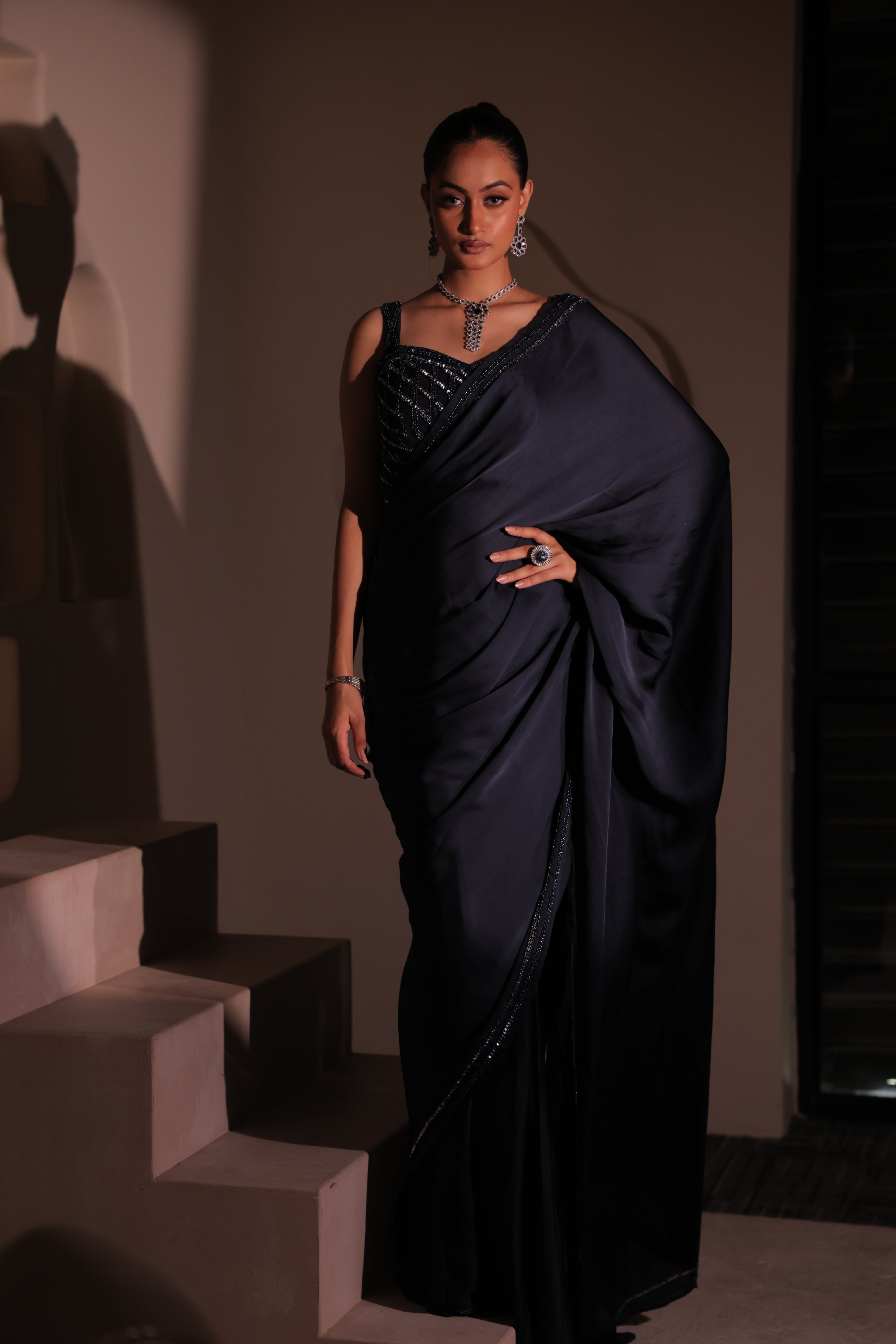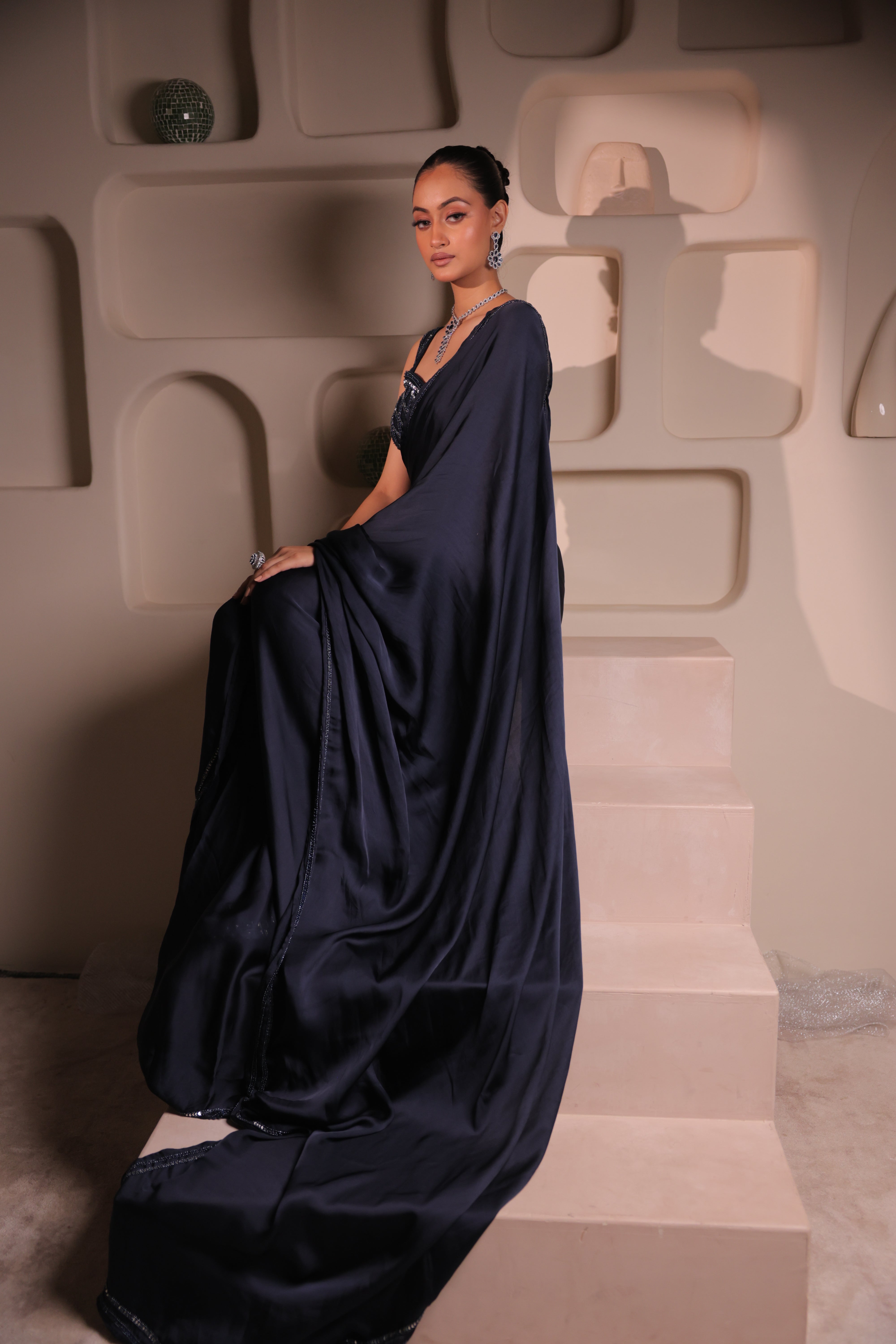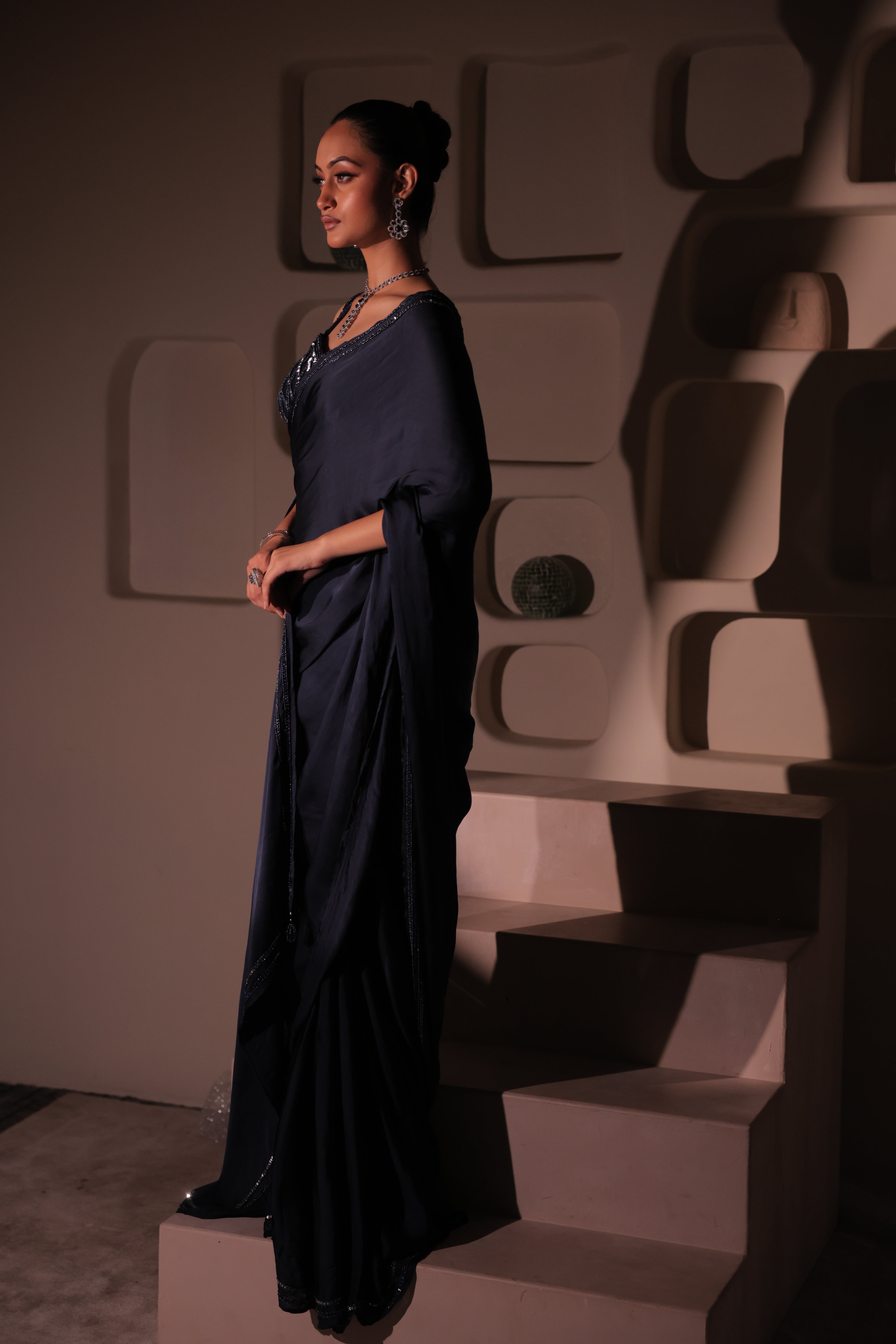 Complementing the saree is a meticulously designed Midnight Blue Embellished Blouse. This blouse is typically adorned with intricate hand-embroidery, featuring shimmering sequins, delicate beads, or crystal work that stands out against the rich fabric. The sleeveless cut and sophisticated neckline complete the modern and glamorous look.