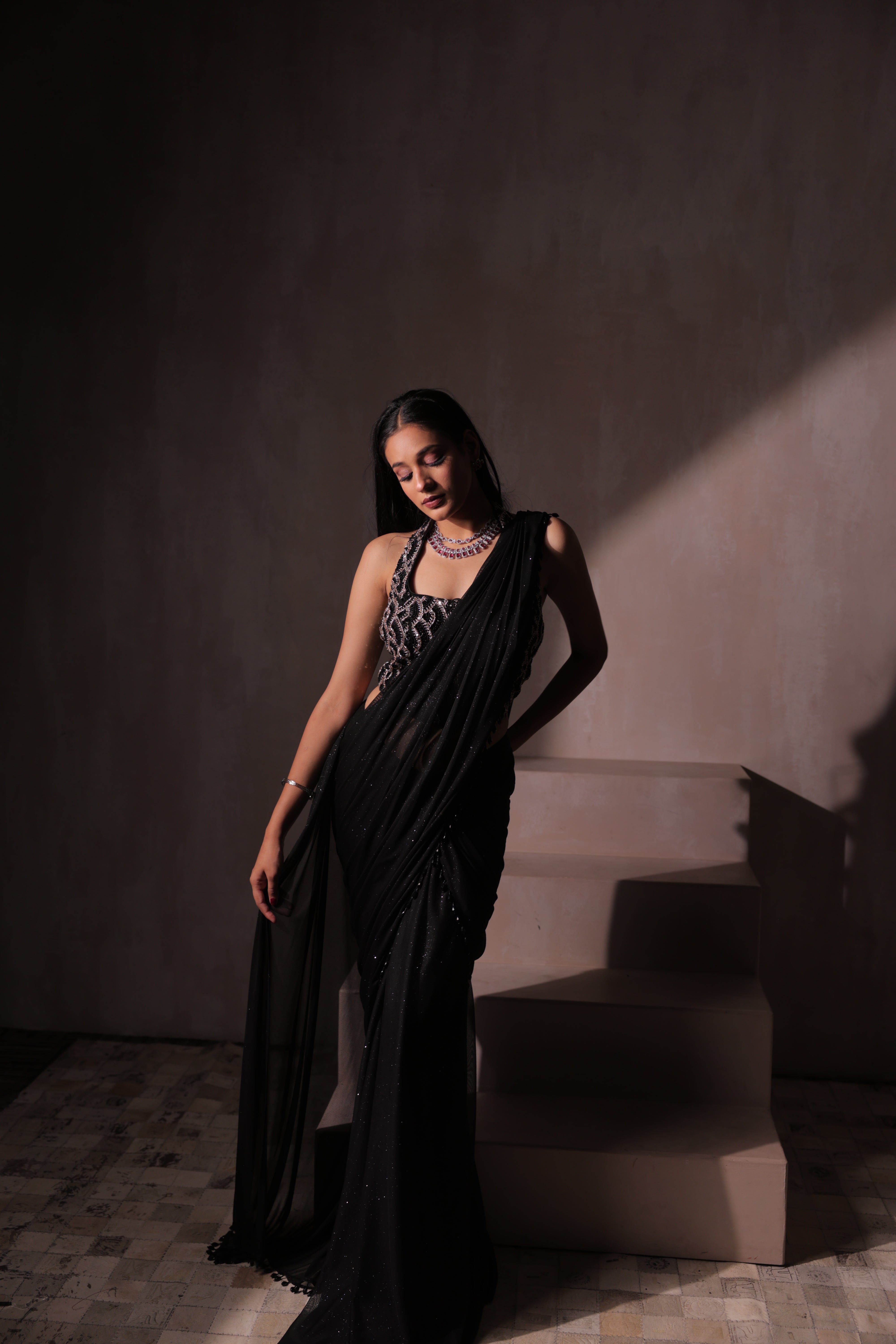 The saree portion is crafted from a fluid, glitter-infused sheer fabric (like sparkle net or shimmer georgette) in deep Black. It is expertly designed as a Pre-Draped/Ready-to-Wear Saree, which guarantees a flawless and elegant drape in minutes without the hassle of traditional pleating. The lightweight, flowing fabric adds dramatic movement and a subtle, all-over shimmer that elevates the entire look.
