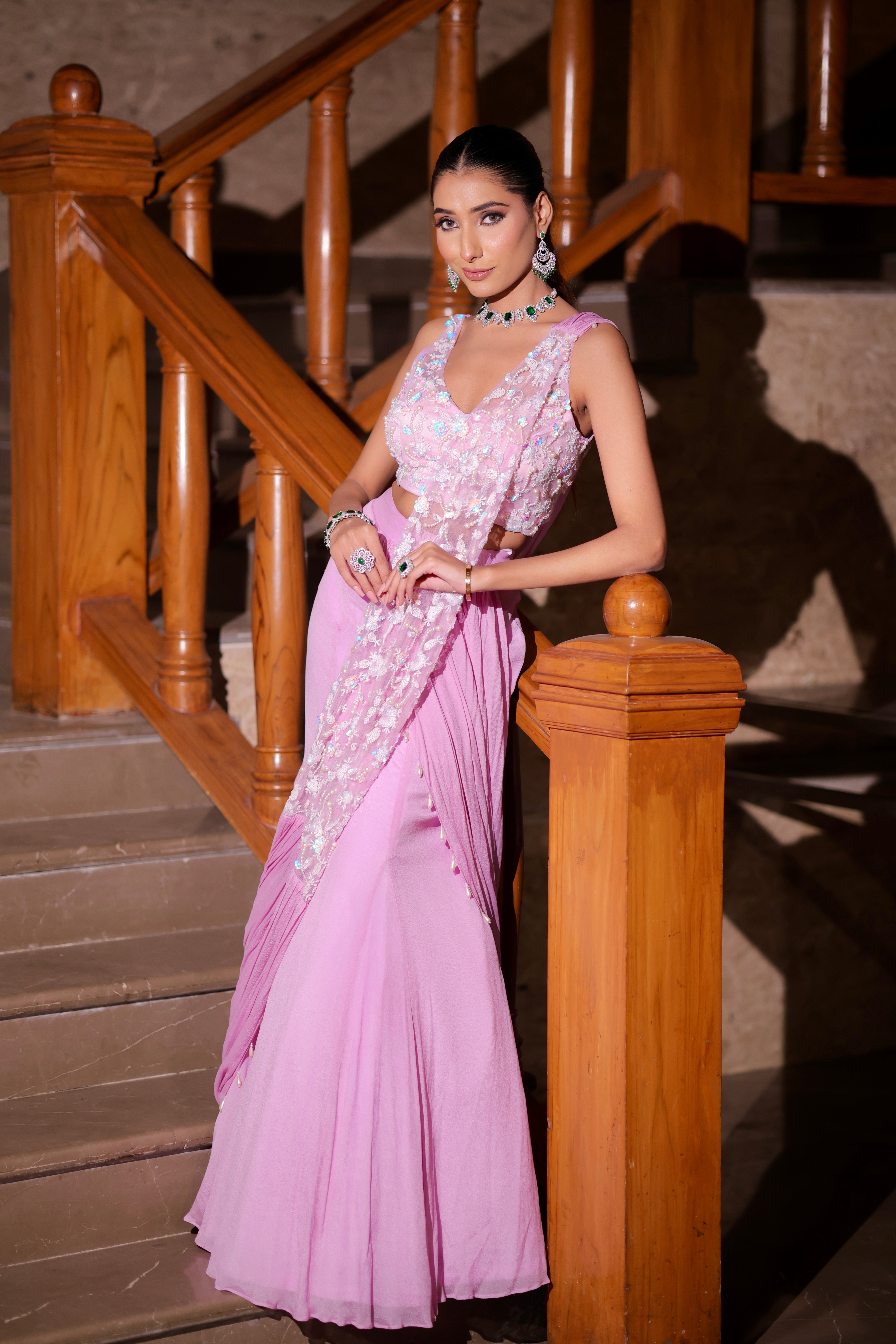 Drape yourself in modern romance with this stunning Blush Pink Sculpted Pre-Draped Saree Set. This ensemble masterfully combines a feminine pastel hue with high-fashion, contemporary styling, making it the perfect choice for receptions, cocktail parties, sangeets, and elegant evening events.