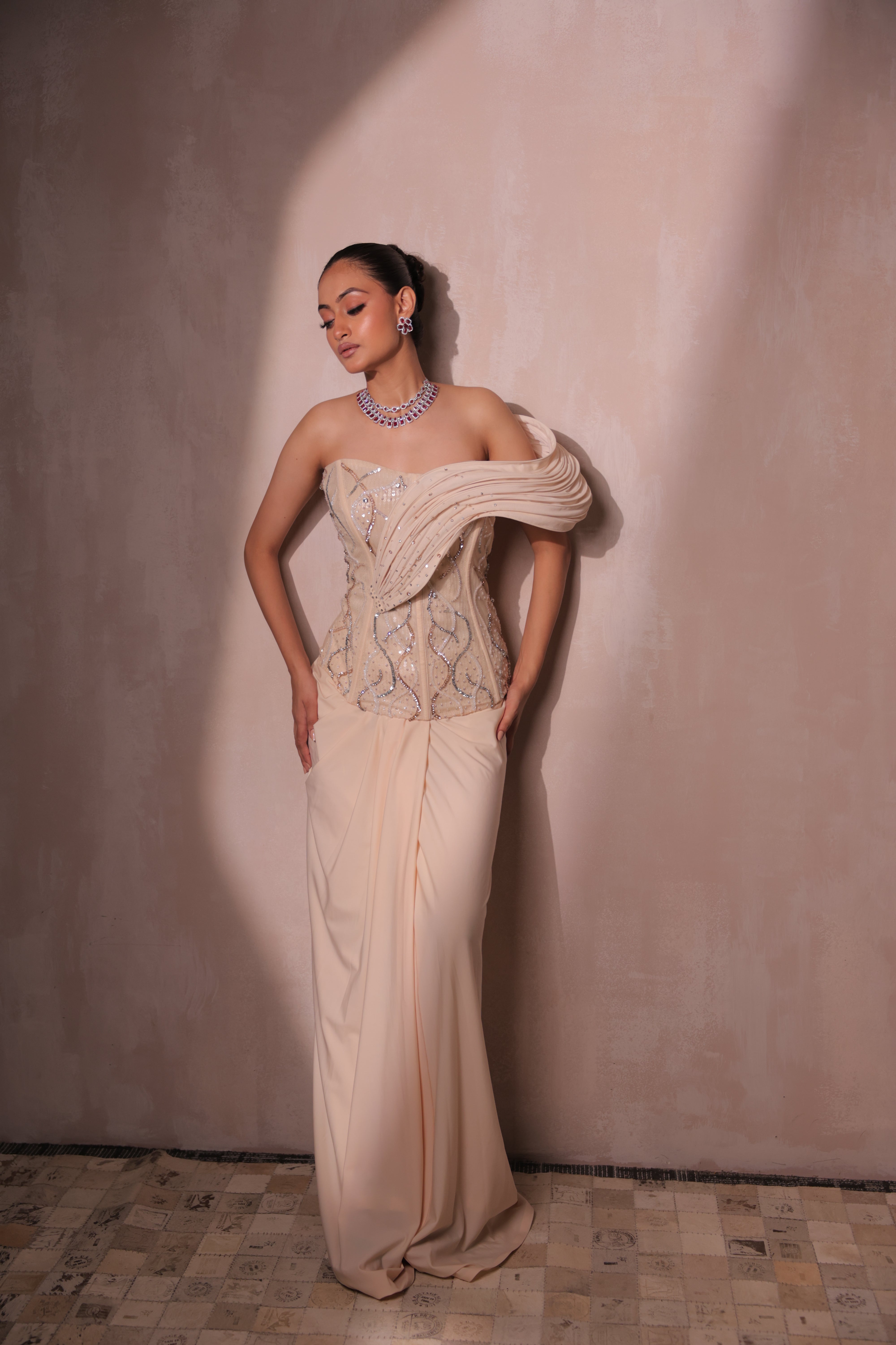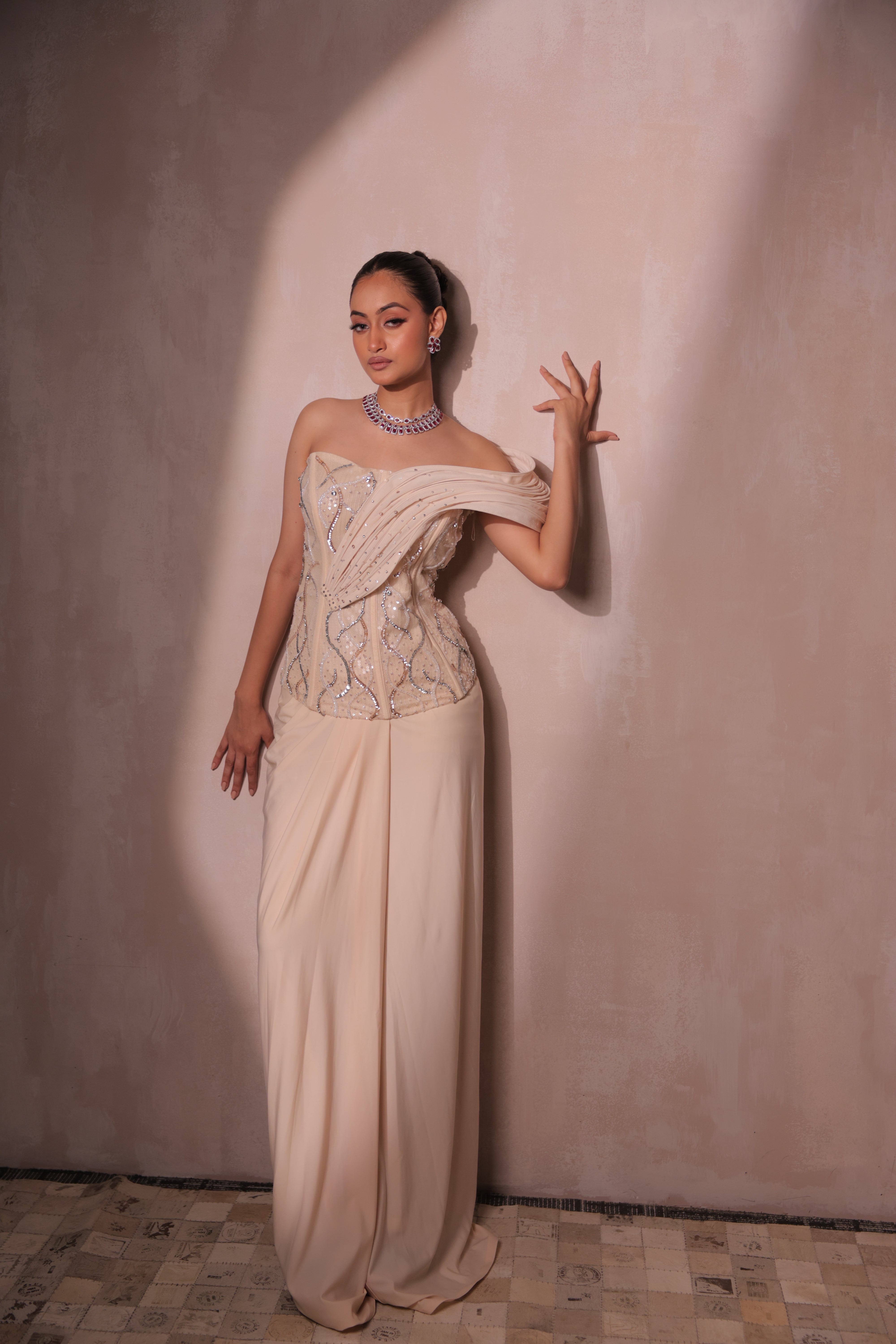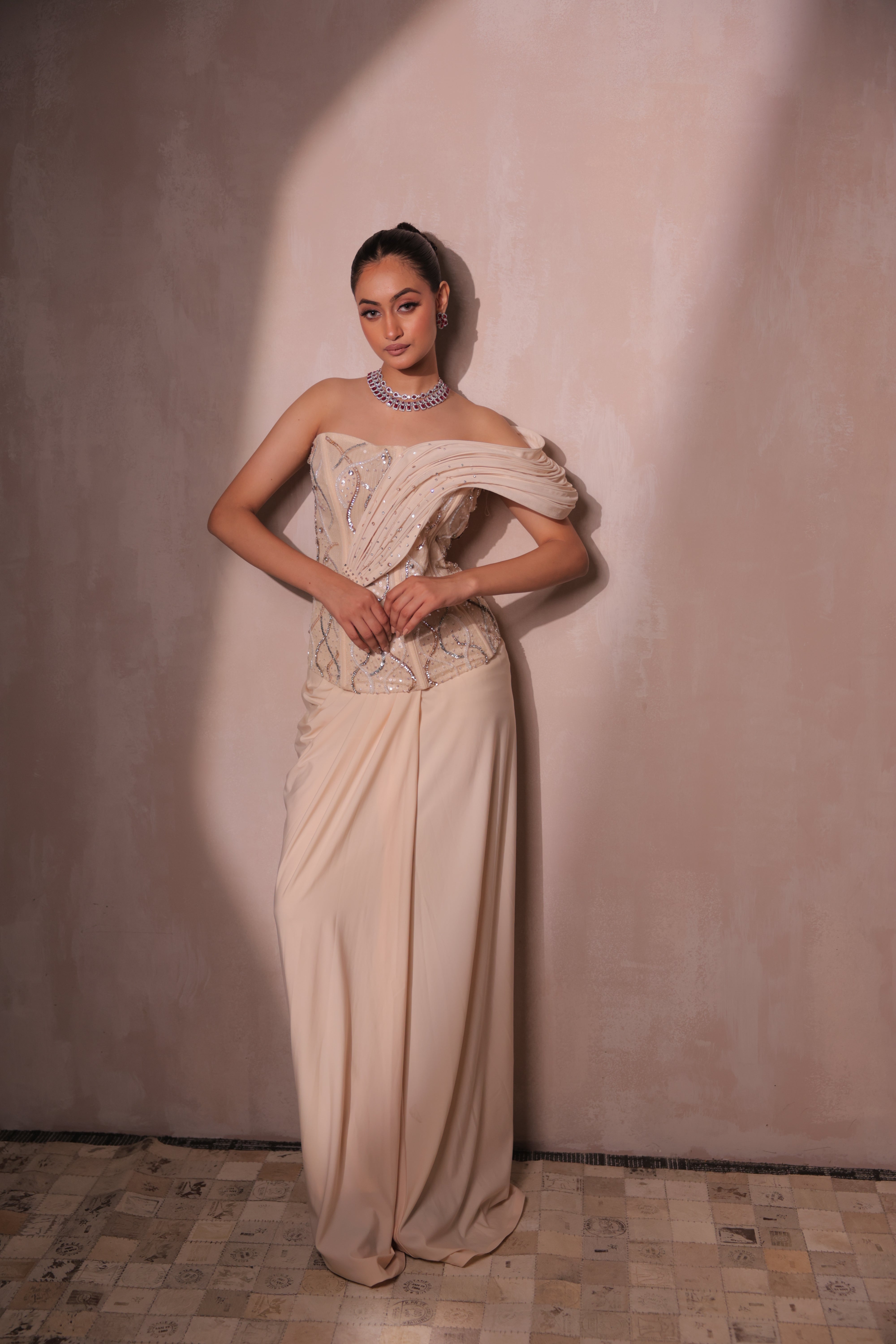 The lower half of the gown flows into an elegant Ivory Draped Skirt. Made from a smooth, luxurious fabric (like crepe or satin), the skirt features soft ruching at the waist that transitions into a clean, figure-flattering sheath silhouette. The subtle draping detail ensures a sophisticated, liquid-like movement as you walk.