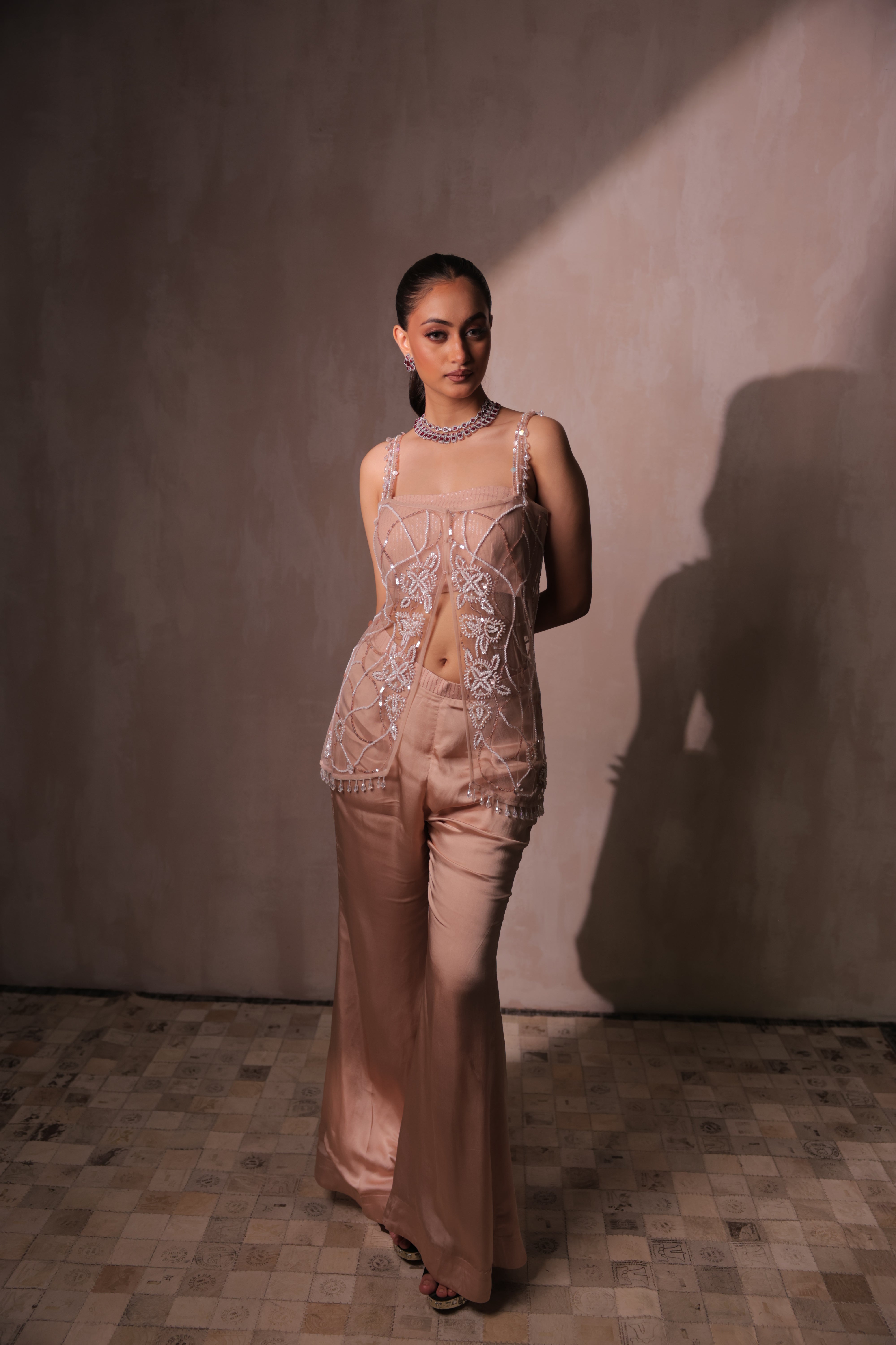 Fabric & Color: Crafted from a luxurious blend of sheer Organza and fine Net fabric, this pant suit boasts a soft, universally flattering Dusty Pink (or Blush Pink) hue. The lightweight, airy texture of the fabric creates a graceful, ethereal drape.