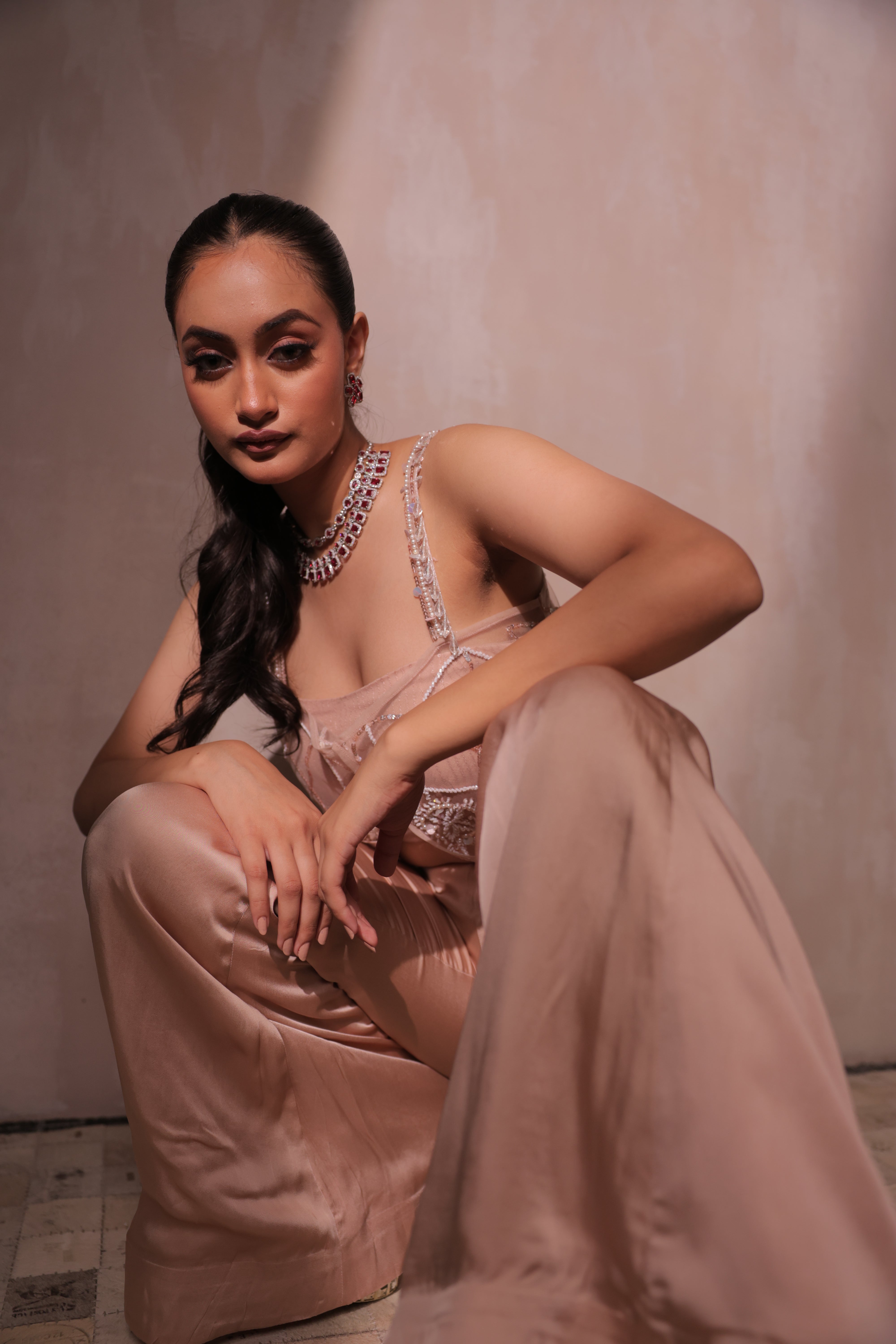 Elevate your festive and party wardrobe with this breathtaking Dusty Pink Organza and Net Pant Set. This contemporary ethnic ensemble offers the perfect fusion of traditional Indian craftsmanship and modern, chic styling, making it an ideal choice for wedding functions, cocktail parties, and grand celebrations.