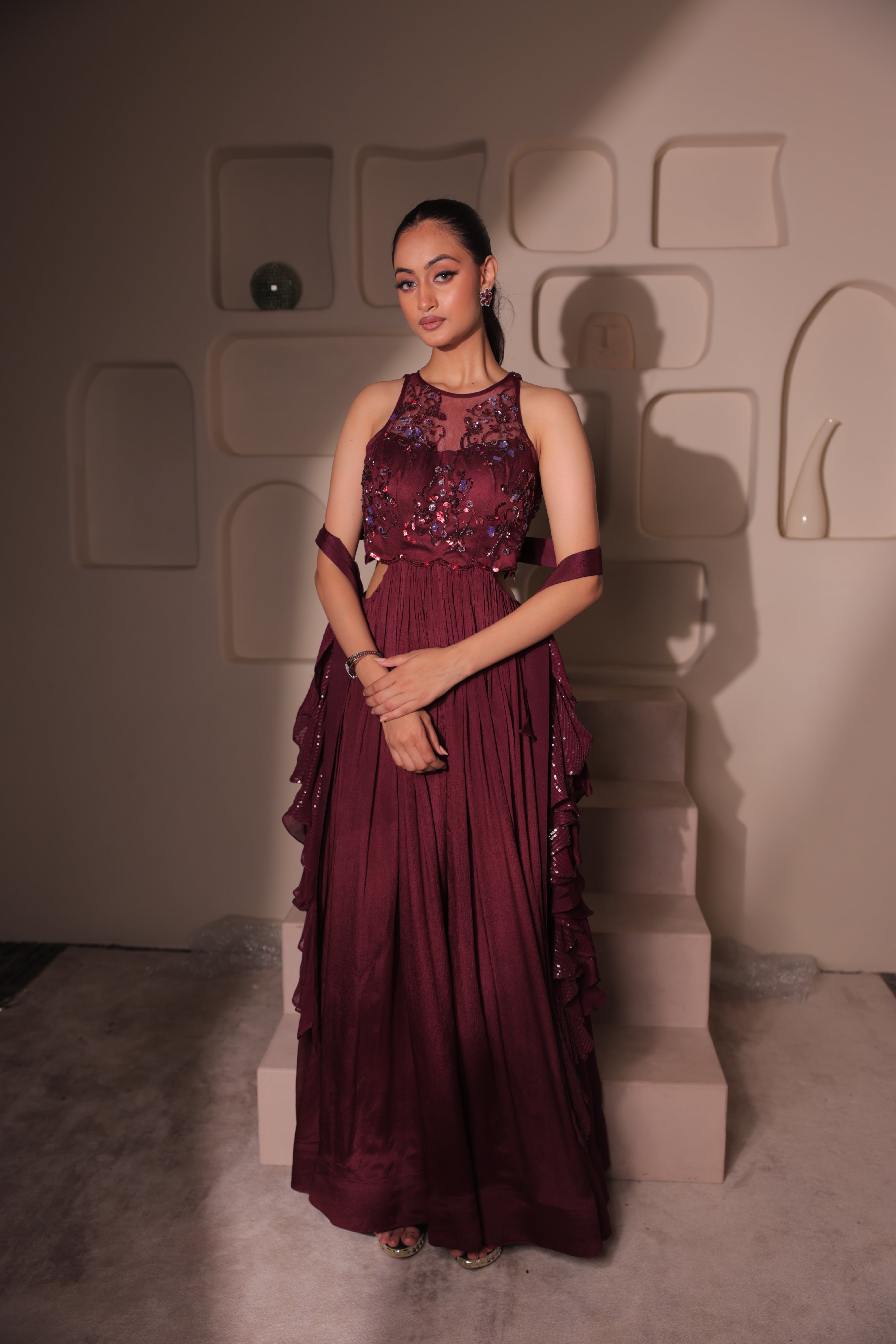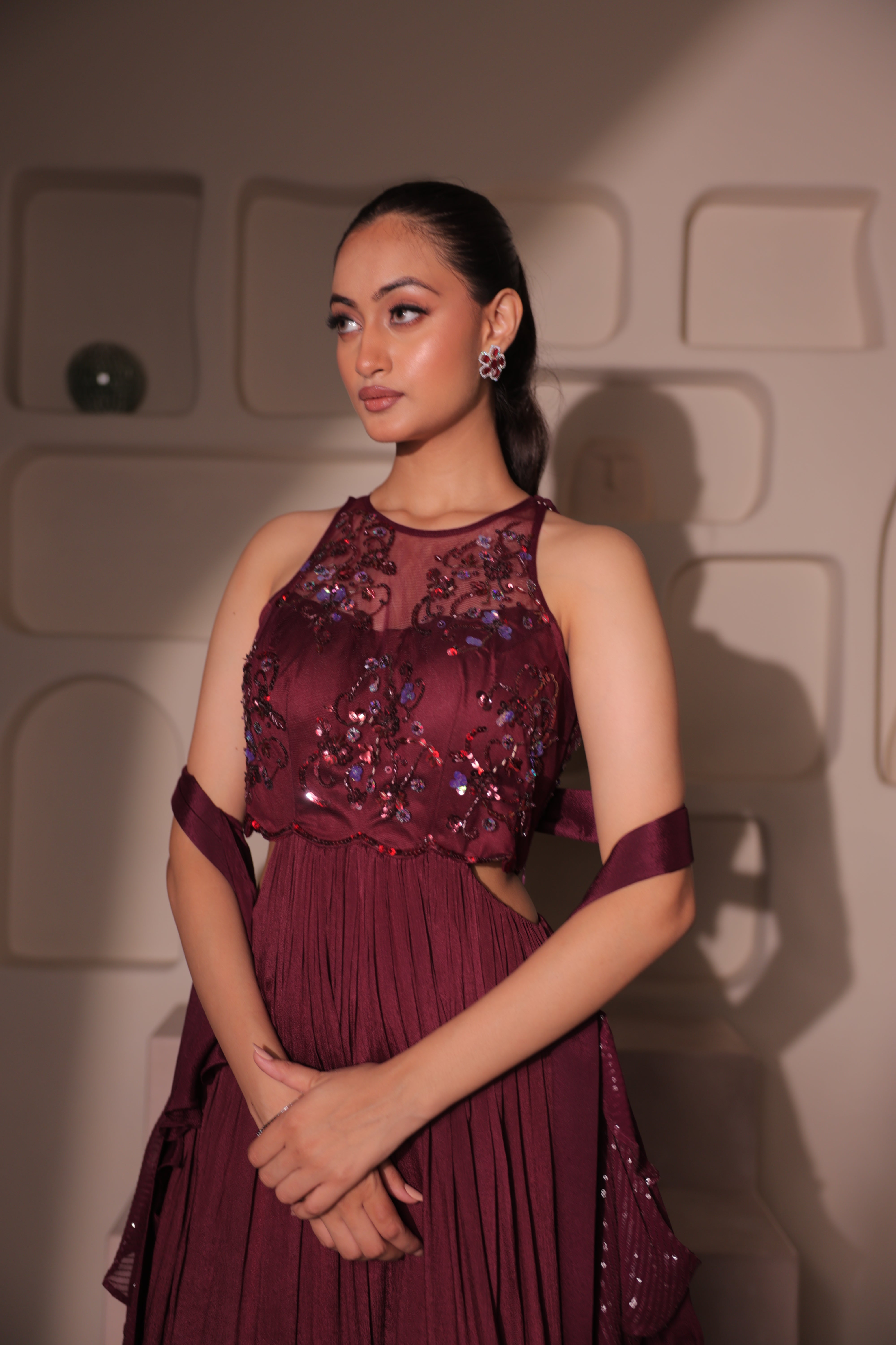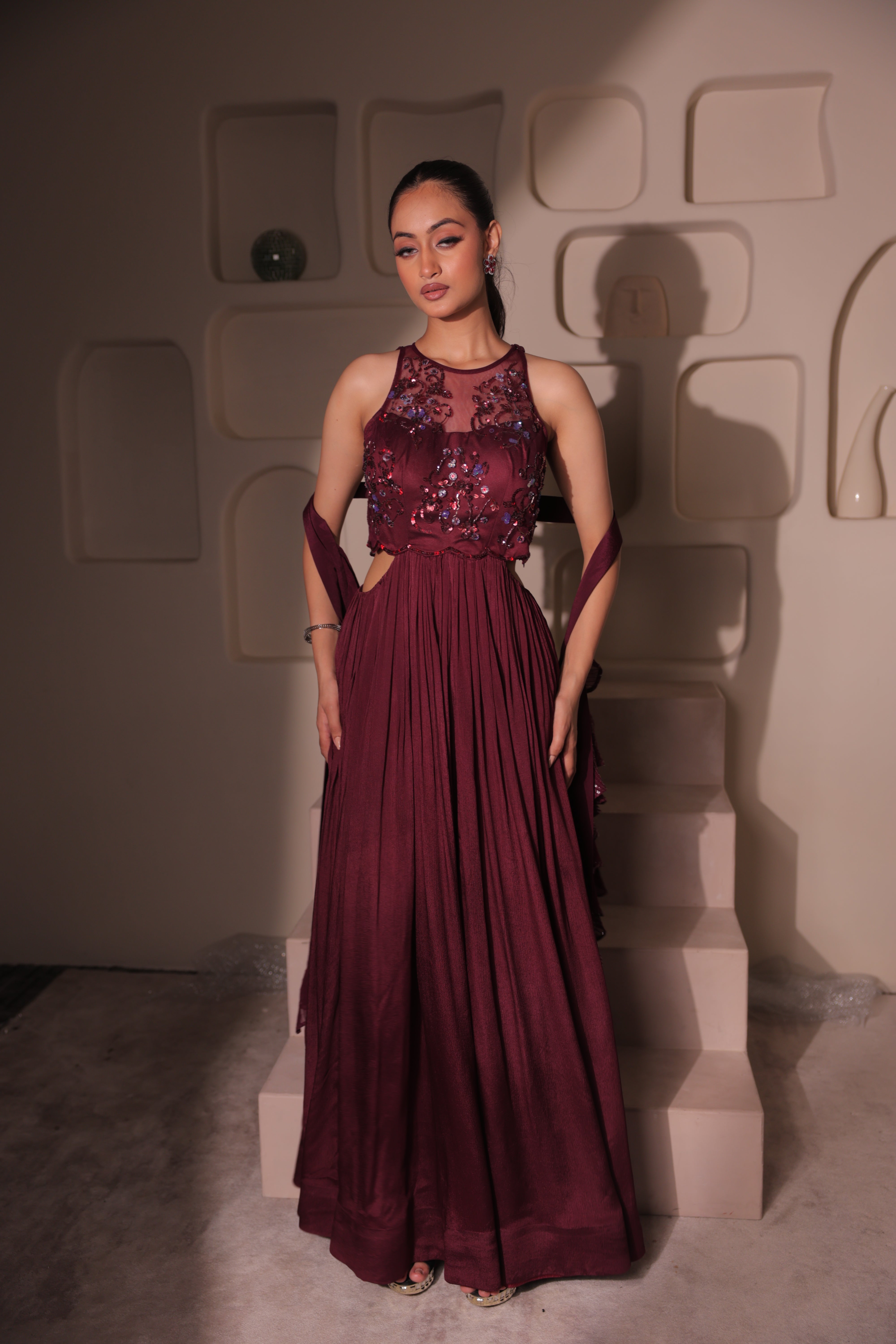 What truly sets this gown apart are the elegant side cut-outs, strategically placed to reveal a hint of skin, adding a contemporary and bold touch. Below the cinched waist, the Burgundy skirt flows in soft, luxurious pleats, crafted from a rich fabric like georgette or chinnon. The full-length, flowing silhouette ensures majestic movement and a regal presence.