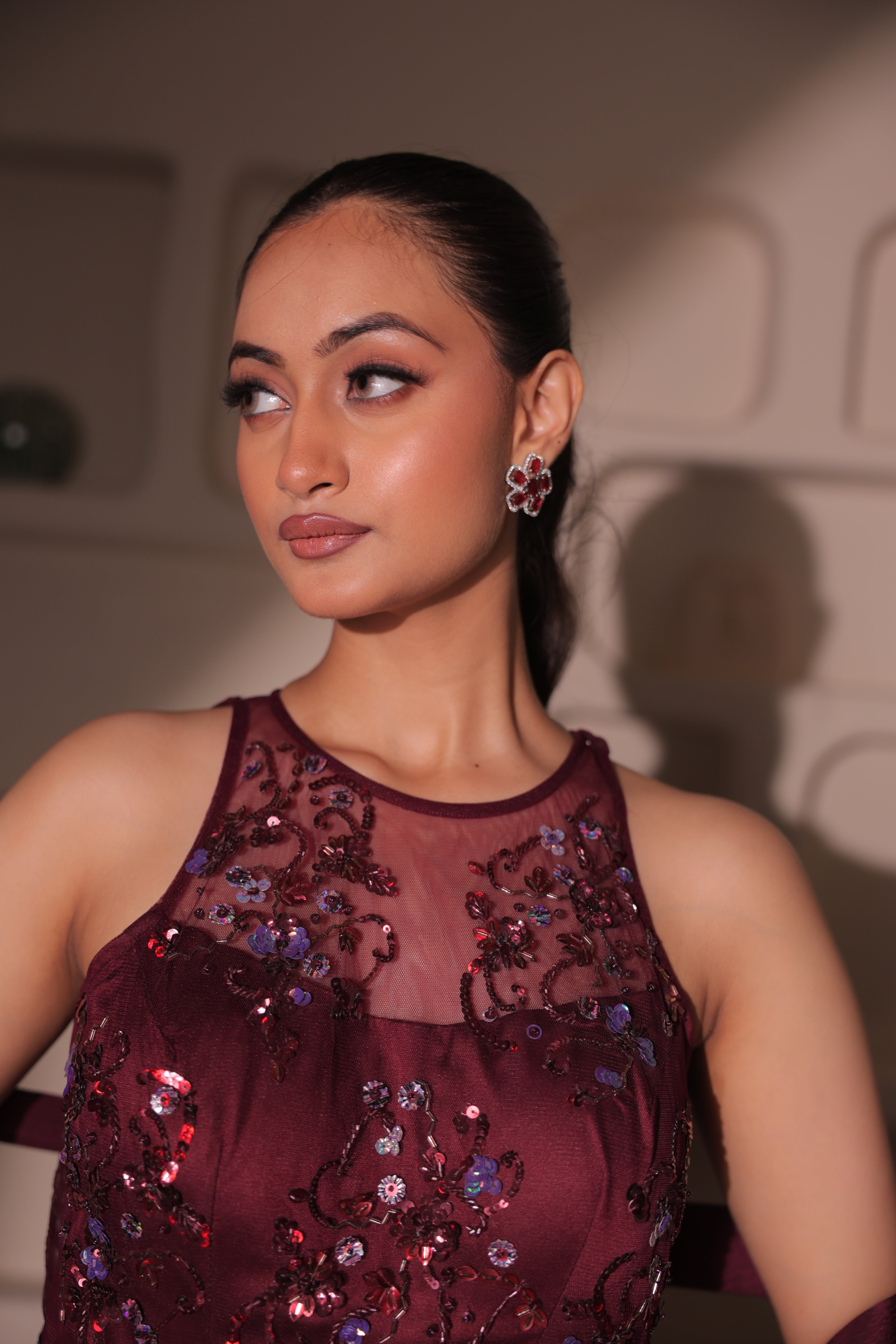 Make an unforgettable statement in this striking Burgundy Embellished Cut-Out Gown. This sophisticated evening dress masterfully combines rich color, intricate detailing, and daring modern cuts, making it the ultimate choice for grand receptions, cocktail parties, galas, and high-fashion events.