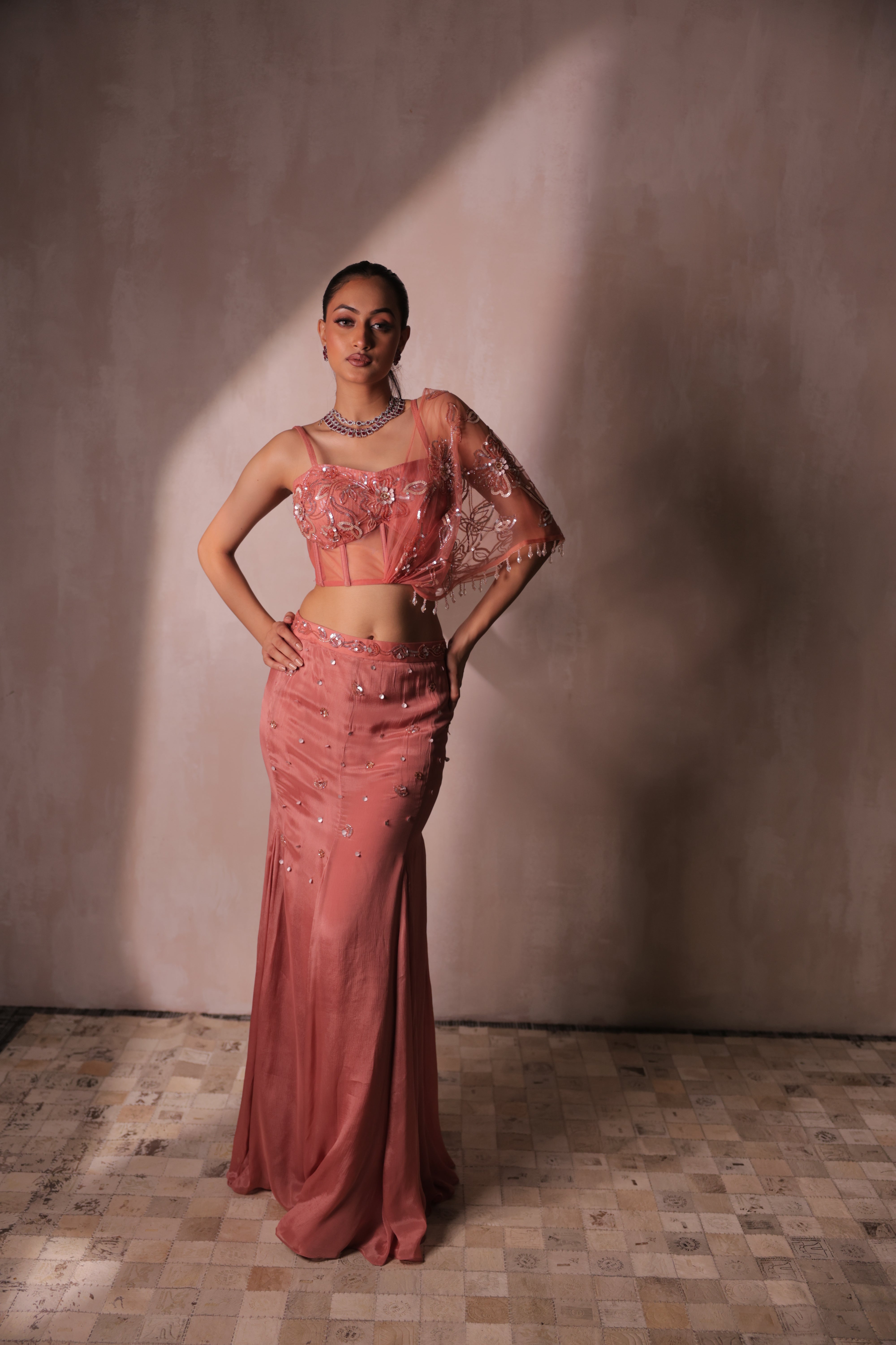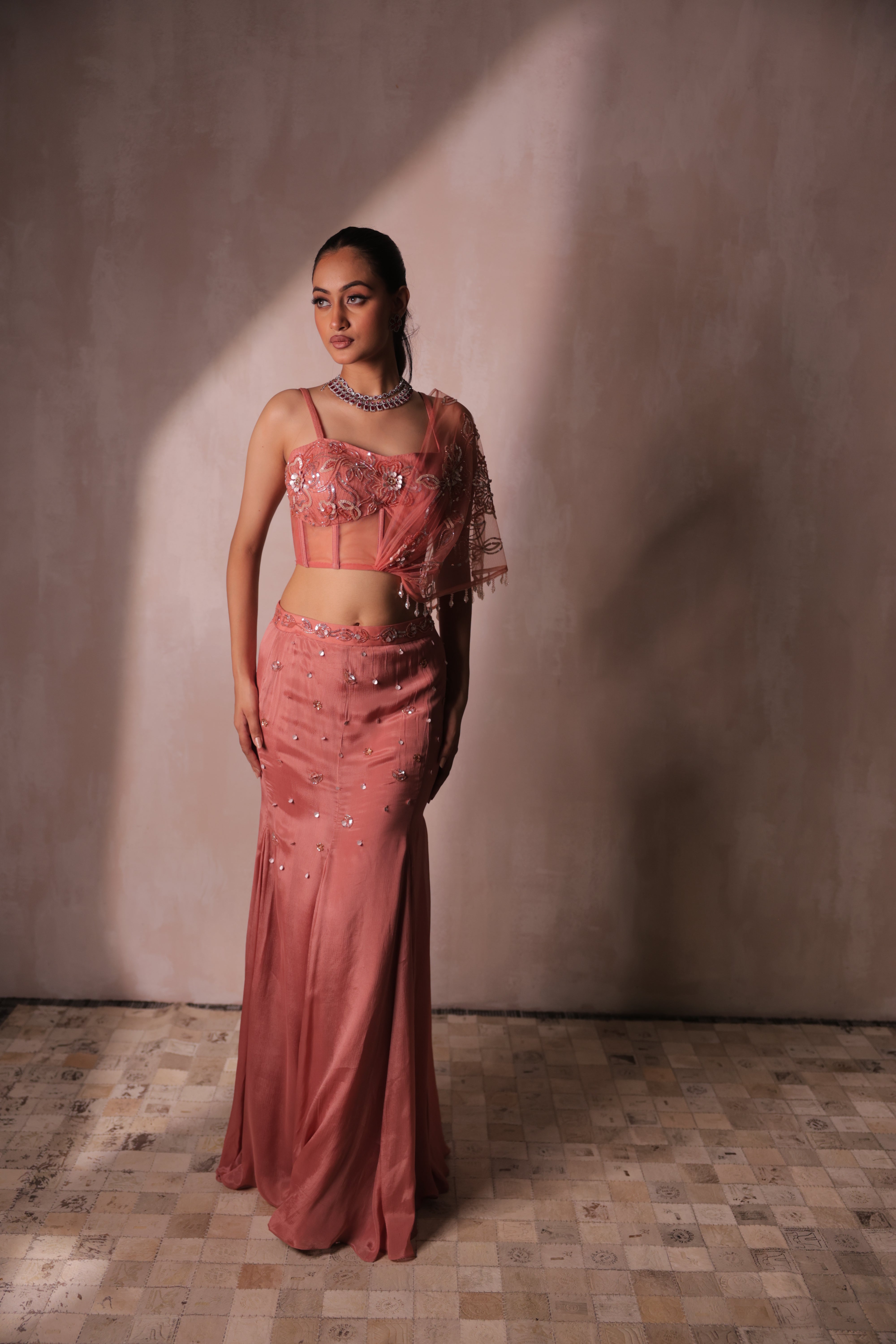 Make a bold yet graceful statement with our pink draped skirt set, designed for modern celebrations with a touch of timeless elegance. The fluid draped skirt flatters every curve, while the intricately hand-embroidered cape blouse adds a layer of sophistication and drama.
